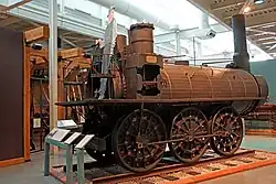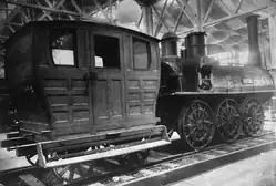 Samson served from 1839 to 1867 carrying coal on the six-mile line from the mines around Stellarton and New Glasgow to the East River loading pier. It proved a strong and reliable locomotive, considered "slow but of great power" by railway workers of the day.[3] One former engineer recalled how it moved a heavy string of coal cars from a crooked siding on a wet day when a more modern locomotive failed to move them.[4] In addition to its regular duties moving coal cars, Samson also saw service carrying passengers in an early design of a passenger coach. The locomotive was semi-retired in 1867 but continued to operate when necessary until 1885.[5] It was sent to Chicago to the National Exhibition of Railway Appliances in 1883.