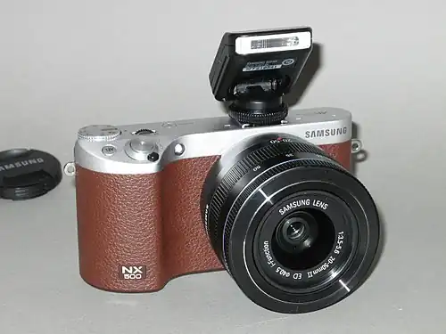 The Samsung NX500 is a mirrorless interchangeable lens camera announced by Samsung in February 2015. Like the flagship Samsung NX1, it has a 28-megapixel back-illuminated sensor, but lacks the electronic viewfinder of the top model. It succeeds the Samsung NX300.