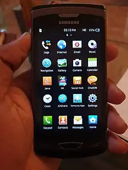 The Samsung Wave II (model number GT-S8530) is a discontinued smartphone developed and produced by Samsung Electronics. It is the successor of the Samsung Wave S8500 smartphone and runs on Samsung's Bada 1.2 operating system, which was commercially released in October 2010.[1][2][3] The Wave II is a touchscreen phone powered by a proprietary 1 GHz ARM Cortex-8 CPU and a built-in PowerVR SGX 540 graphics engine, SLCD display and a 720p camera.[4] As the phone contained an LCD display, SlashGear speculated that the phone could be the result of a rumored AMOLED panel shortage.[5]