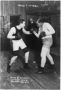 In 1909 Berger faced heavyweight champion Jim Jeffries in at least five exhibitions in Pennsylvania and New York, and had two exhibition with him in California in 1910. At the time, Jeffries was one of highest paid vaudeville attractions in the United States, having retired undefeated as Heavyweight champion, and Berger's management of Jeffries was a lucrative proposition.[17][18][19] He managed Jeffries for his fight in Reno, Nevada against black heavyweight champion Jack Johnson on July 4, 1910. As quite a profitable affair, the "Fight of the Century", drew 20,000, and fetched over $100,000 to divide between Berger, various trainers and support personnel, and Jeffries, whose cut was $60,000.[20]