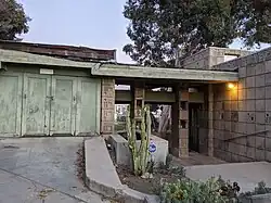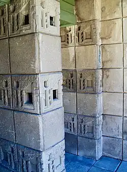 Some of the textile blocks are plain, while others are engraved with motifs.[45][46] The juxtaposition of plain and engraved blocks is the only ornamentation used on the house's facade.[45] Since only one face of each engraved block contains decorations, the outer walls are made of two layers of blocks, with an air gap between them; this allowed both the interior and exterior faces of the walls to have engraved patterns.[47][48] The engraved blocks' decorations are variously cited as depicting the site layout,[49][50] an overlaid square and chevron,[46] or a combination of the site plan and a eucalyptus tree.[49][51][c] Sources disagree on how many types of blocks were used, although at least three types (a plain block and two variants of the engraved block[46]) have been identified.[14] The blocks on the southern facade are alternately protruded or recessed,[52] and the blocks are laid in a more complex pattern as the facade ascends.[53] The facade also includes vertical piers with alternating plain and engraved concrete blocks.[46] Other parts of the facade contain perforated concrete blocks.[3][46][30] The textile blocks absorbed moisture easily and were prone to decay because of impurities that existed when the blocks were cast.[19][54]