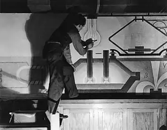 Samuel Gompers High School is the site for a notable Federal Art Project mural created in 1936 by Eric Mose. The three-panel, 600-square-foot[3]: 141 fresco, Power,[4] was created in the school library. The work was described in an April 1938 article in The New York Times:[5]