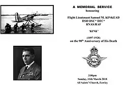 In 2018, the 90th anniversary of his death, a special memorial service[7] was held at All Saints' Church, Fawley on 11 March. The service was conducted by Padre Glyn Williams,a retired RAF padre, with a tribute by Julian Lewis MP.