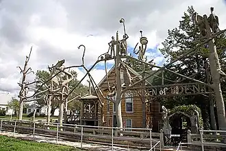 Dinsmoor built and moved into a log cabin on a lot that he named the Garden of Eden in Lucas, Kansas. The cabin is a twelve-room house; the logs are made up of limestone quarried near Wilson Lake. Dinsmoor designed his landscape and spent the rest of his life creating the garden, which contains over 200 concrete sculptures. The sculptures and design of the house reflect Dinsmoor's belief in the Populist movement and his religious convictions, it includes a Labor Crucified figure that is surrounded by the people who put him on the Cross, a doctor, lawyer, preacher and capitalist.[5]