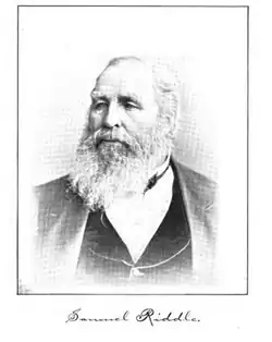 Riddle lost his first wife Martha after her death during childbirth of his first child, Henry, in 1850. He remarried 23 year old Linda Doyle and together they had four children.[7] Their son, Samuel Doyle Riddle was an American businessman and racehorse owner. Riddle died on February 19, 1888[8] and is interred at Middletown Presbyterian Church Cemetery in Elwyn, Pennsylvania.[9]