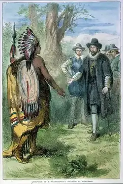 Once settled in Lynn, the Rev. Samuel Whiting Snr. established his home with his wife and two children across from the settlement's meetinghouse. Their garden was known by the community for its variety of fruit and vegetables, and for the apple cider produced by its trees. He also was given 200 acres of land in 1638. He was greatly respected by his community, and was "peculiarly amiable." When among groups of people, he would "kiss all the maids" and "he felt all the better for it." They were said to "hug their arms around his neck and kiss him right back." Whiting Snr. was described as being "a man of middle size and straight fine hair". He attempted to communicate with - and likely convert - the Native Americans. In the 1640s, he took an Indian girl into his household given over by her mother. He gave her an education and she became a part of his family, but eight years later, she ran away back to her tribe. Whiting Snr. was said to be heartbroken when she left. He was a colleague of the Rev. John Cotten who was the pastor at the First Church in Boston from 1633 until 1652. Whiting Snr. had first lived with Cotten's friend Atherton Haugh/Hough (c. 1593 - 1650) upon his arrival in Boston, Massachusetts in 1633. Haugh had travelled to Massachusetts Bay Colony on the same ship - the Griffin - as Cotton and had been Mayor of Boston, England, in 1628, so he was familiar with government affairs, as too was Whiting Snr., whose father had also been a Mayor of Boston in Lincolnshire, England.[27][28]