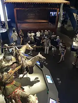 In addition to armor, helmets, masks, weapons, swords, and sword jewelry, the permanent exhibition also offers insights into wide-ranging areas of samurai culture, society, religion, and craftsmanship. These also include sculpture and painting, a lifelike Nō theater and Nō masks, and a freestanding teahouse with utensils used in the Japanese tea ceremony.[3]