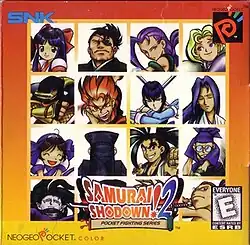 Samurai Shodown! 2 (Japanese title: Samurai Spirits! 2 / サムライスピリッツ! 2) is a handheld game in SNK's Samurai Shodown series of fighting games, released on the Neo-Geo Pocket Color in 1999. Unlike its predecessor, which was released for the monochrome Neo Geo Pocket, it features full color graphics. It was designed as a conversion from the most recent game in the Samurai Shodown series, Samurai Shodown 64: Warriors Rage, and almost all of its story events, endings and cutscenes are derived from its arcade cousin. Almost all of the characters from Samurai Shodown 64: Warriors Rage are included (the sole exception being Hanma Yagyu). It also re-added two series favorites who were not in the arcade release, Charlotte and Yagyu Jubei.