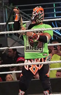 In 2010, Samuray began branching out of the Midwest, making his debuts for Pennsylvania-based International Wrestling Cartel (IWC) and New York-based East Coast Lucha Libre (ECLL).[18][19] On September 25, 2010, Samuray worked in a dark match put together by Berwyn, Illinois-based AAW: Professional Wrestling Redefined for Dragon Gate USA (DGUSA), where he unsuccessfully challenged Silas Young for the AAW Heavyweight Championship in a three-way match, which also included Gran Akuma.[20] During 2010, Samuray made his first wrestling tour of Mexico.[4] During another tour of Mexico in April 2011, Rodriguez suffered a serious injury at an event held by independent promotion Desastre Total Ultraviolento (DTU), when he landed on the concrete floor and hit his head on a guardrail after diving out of the ring onto his opponents.[9][16][21] In the aftermath of the injury, Rodriguez began suffering from post-concussion syndrome and fell into depression and contemplated retiring from professional wrestling before receiving a call to take part in a three-day tryout camp for WWE.[9][16] Though he was not offered a contract, knowing that he was on WWE's radar reinvigorated Rodriguez to continue his career and return to the independent circuit.[8]