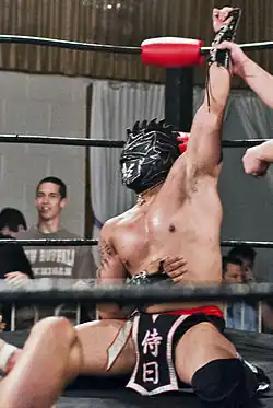 During mid-2011, Mexican luchador Crazy Boy, who saw Samuray during his Mexican debut, got him a spot in AAA's reality television program ¿Quién Pinta Para La Corona?.[9][22] While taking part in the program, Samuray also returned to Crazy Boy's DTU promotion.[23][24][25] During the taping of the program, he also underwent further training under veteran luchador Gran Apache, whom he credits with "perfecting [his] career".[26] Although he did not earn a contract with AAA through the program,[27] Samuray was able to make his AAA main card debut on August 19, 2012, when he teamed with Joe Líder and Juventud Guerrera in a six-man tag team match, where they were defeated by the villainous La Sociedad trio of Daga, Dark Dragon and Psicosis.[28] During September, Samuray worked several multi-man tag team matches against Los Inferno Rockers (Devil Rocker, Machine Rocker, Soul Rocker and Uro Rocker), losing all of them.[29][30]