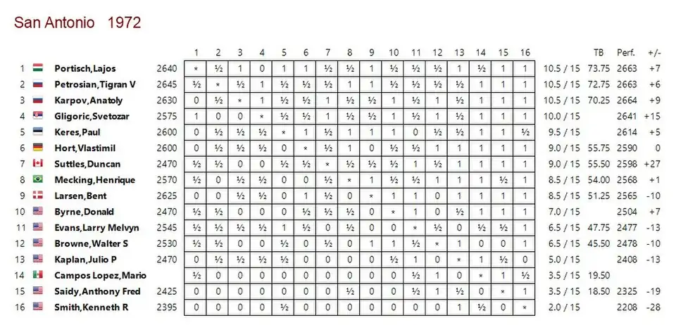 The three-way tie for first place among Petrosian, Portisch and Karpov (all with 10½ /15), confirmed the pre-tournament prediction for Petrosian, Portisch's status as a top 10 player, and the arrival of Karpov at the elite level.