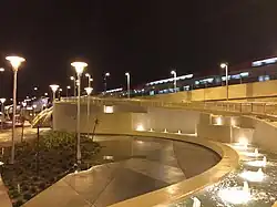 The expanded plaza adjacent to Artichoke Joe's Casino would be dedicated as Posy Park.[12] Posy Park has a water feature consisting of a fountain with cascading terraces running down from the station to street level. However, shortly after the San Bruno Grade Separation Project was completed, inspections revealed cracks in the concrete and protective coating, causing rust to the reinforcing steel rebar, and the fountain was turned off. A request for bids to rehabilitate the fountain was posted in September 2017, but no bidders materialized, and a direct solicitation resulted in an estimate of $125,000 to recoat the concrete.[18]