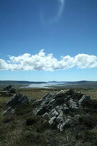 San Carlos Water is a fjord-like inlet at an angle of 45° to the Falkland Sound coastline, thereby offering shelter from the weather in the Sound (which is itself sheltered from the South Atlantic by bluffs in the north and an archipelago in the south). The inlet is 9.3 miles (15 km) in length and for about half of its length, is about 1.2 miles (2 km) wide. It is flat-bottomed with a depth of between 20 and 30 metres (66 and 98 ft); the 20 m isobath lying about 660 feet (200 m) offshore.[1] The tidal range at Port San Carlos varies between 0.9 and 1.6 metres (2 ft 11 in and 5 ft 3 in) (for neap and spring tides respectively) with low water being between 0.3 and 0.7 metres (1 ft 0 in and 2 ft 4 in) above the chart datum.[2] The San Carlos settlement lies close to the head of the inlet.