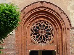 The Romanesque church is a small hall ending with a small semicircular apse. The façade has a richly decorated brickwork portal with a Gothic rose window. The façade of the Ducal Chapel has a simple portal flanked by Gothic mullioned windows, according to a model established by Guiniforte Solari, and traces of frescoes of Saints from the 15th century.