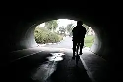 The Class 1 path begins on an uphill stretch, followed by a downhill ride through a canyon area, part of a land development named Shady Canyon. Ultimately, the path leads to an entrance guard house, and continues to the left on a section of Class I path. Taking the sidewalk to the right of the guard house leads back to surface roads. Taking the first right on Sunnyhill leads to a crossing into a small park, where there is a sidewalk / bike path that heads back uphill. This ends on a downhill street which leads to an intersection. Turning left at the intersection and using the sidewalk, which doubles as a bike path, leads downhill to the entrance to another Class 1 bike path, which snakes downhill on a narrow greenway passing under streets in special tunnels.