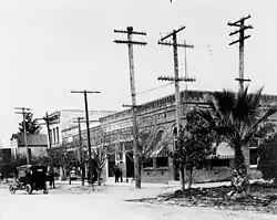 The arrival of the Los Angeles and San Gabriel Valley Railroad in 1887, later purchased by Santa Fe Railroad, led to La Cienega Mud Springs being first mapped.[15][16] The ensuing land boom resulted in the formation of the San Jose Ranch Company, which first laid out streets. Small businesses began to open soon thereafter, and the city took on a new name: San Dimas. Growth was rapid, and San Dimas soon became an agricultural community. Wheat and other Midwestern United States crops were planted first; then orange and lemon groves covered the town and the San Gabriel Valley. At one time, four citrus packing houses and a marmalade factory were located in San Dimas. The Sunkist name originated here, first spelled "Sunkissed".[10] Oranges were the major crop and business in San Dimas until the mid-20th century.
