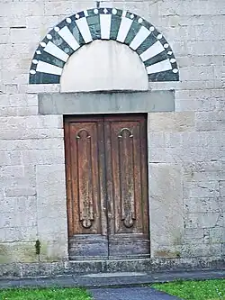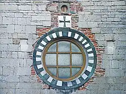 The polychrome wooden Crucifix located behind the altar is also from the 16th century. Within the courtyard is a facade that has a white and green Prato marble archivolt portal.[1]