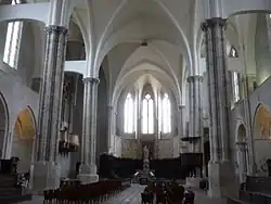 The main altar rises before a semicircular apse, well lit by windows. Along the walls are carved wooden choir stalls. On the back wall, in the center, is an altarpiece depicting a Crucifixion with St John and the Virgin (1590) by Pietro Paolo Sensini. In front of this is a large marble statue of San Fortunato on a high pedestal putatively added in 1643 as a votive offering when the city was spared sacking during the first War of Castro. The altar was made in the 16th-century deriving the present columns from an older altar. The bishop Angelo Cesi excavated a crypt below the altar to house the relics formerly in the prior altar. The saints depicted between the arches were painted (1861) by Luigi Sabatini.[5]