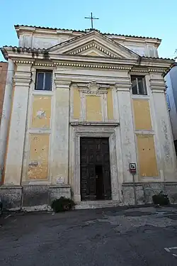 Francis of Assisi himself had preached for some weeks near the town of Orte, and one of his followers, Teobaldo d'Assisi died in one of the first Franciscan convents, located near the Town along the Tiber river. The Franciscans moved first to San Teodoro, then the Romanesque church of Sant'Angelo at this location.[1] The crypt of the church appears to derive from this ancient church. A convent was founded alongside this church. In 1695, the Franciscans commissioned reconstruction of the church, providing for its present layout. In the 18th-century,the church was assigned to the Compagnia della Misericordia, a confraternity and they provided some of the present decoration including the main altarpiece.[2] The facade is mainly a sober temple front with awkwardly arranged pilasters. The interior has some six Baroque side altars.
