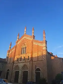 The facade, built between 1290 and 1310 in the Gothic style, is characterized by a decorative effect built on the contrast between the red of the brick and the white of the sandstone. It has, an unusual case in Italy, a double portal, according to the French style, whose openings are surrounded by a two-tone decoration. The intermediate part is entirely in brick and houses a large three-light window. The upper part of the slopes is limited by a decoration of intertwined brick arches on a light background. The building has two different types of roofs: the western part, open to the faithful, has a wooden roof in the central nave, completely different is the coverage of the space, once reserved for the friars, covered by rib vaults.[9] The side chapels were added between the 14th and 15th centuries and house numerous works of art. Starting from the right you will find: I chapel: built between 1392 and 1398 by Giorgio Rossi, it was frescoed by Giovannino de 'Grassi, traces of these paintings can be found in the crossing of the nave. II chapel: The chapel was consecrated in 1392 by a member of the Rossi family and preserves an altarpiece with St. George on horseback by Bernardino Ciceri. III chapel: preserves a painting by Pietro Antonio Magatti depicting the apparition of Saint Francis of Paola and a late 16th century painting with the Martyrdom of Saint Stephen.