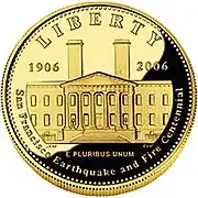 The San Francisco Old Mint Commemorative Coins Act (Pub. L. 109–230 (text) (PDF)) authorized the production of the coin, along with a silver dollar, to mark the centennial of the building's survival of the 1906 San Francisco earthquake and fire. The so-called "Granite Lady" was also viewed as instrumental in helping the city recover from the disaster. The act allowed the coins to be struck in both proof and uncirculated finishes.[1] The coins were released on August 15, 2006.[2]