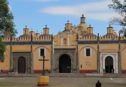 The San Gabriel church and friary was established in 1529 by the Order of Friar Minors, OFM, Franciscans, after destroying the temple to Quetzalcoatl with evangelization as its initial purpose.[2][3][4] The current complex was built in the 1540s, beginning with the Capilla Real in 1540.[5] The main church was begun in 1549, with the first stone laid by Martín de Hojacastro, who would become the third bishop of Puebla.[6] There is also a third chapel by the name of the Capilla de la Tercera Orden and a cloister.[4] The friary is dedicated to the Archangel Gabriel and is one of the largest Franciscan friaries in Mexico.[3][6]