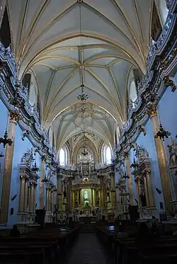 The church has one long nave, which is divided into various sections and covered by Gothic style vaults and cupola. The interior has a Latin cross layout, with Gothic ribs on the vaults and arched window openings. It conserves a number of oil paintings from the 17th and 18th centuries.[3][6] The altarpieces are Neoclassical, made of wood and plaster, painted white and decorated in gold leaf. The main altar dates from 1897 and is dedicated to the Virgin of the Remedies.[2][8]