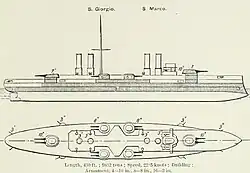 The San Giorgio class was ordered almost immediately after the preceding Pisa-class ships, and was an improved version of that design. The forecastle was extended to improve seaworthiness, turret armor was increased, habitability was improved and the propulsion machinery was redistributed. San Marco was given the first steam turbines fitted in a large Italian ship for comparative purposes with San Giorgio, which retained the traditional vertical triple-expansion steam engines (VTE). San Marco was a very innovative ship as she was the first turbine-powered ship in any navy to have four propeller shafts, the first with a gyroscopic compass, the first with antiroll tanks, and the first not to use wood in any way.[1]