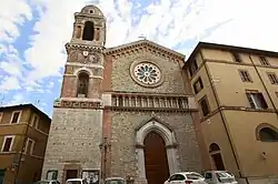 The present church in brick and stone replaced a 14th-century structure, utilizing some of the spolia. It has a large rose window and a unilateral campanile. The interiors contain a 13th-century painted crucifix, a 16th-century Madonna and Child and a painting depicting the Incredulity of St Thomas (1831) by Vincenzo Chialli.
