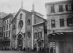 After the unification of Italy, the Municipality of Milan wanted to start an urban renewal plan in the city center. In 1877, the new Via Carlo Alberto, today Via Mazzini, required demolishing old houses and the church itself along the route.[14] Despite the opposition of the institutions responsible for cultural heritage conservation, the municipal administration suddenly decided to demolish the front part of the church. The Waldensian Milanese community bought the surviving portion, undertaking the recovery of the ancient façade, which was dismantled and reassembled in the new position, oblique to the previous one. They consecrated the church in 1881.[15]