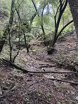 ![]() The upper watershed of San Leandro Creek is densely forested and rugged, in contrast with its highly-urbanized lower reaches (January 3rd, 2023) | |