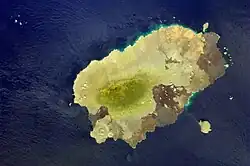 Santiago Island is one of the islands in the Galapagos Archipelago.[5] It was formed from a shield volcano eponymously named Santiago.[6] The oldest lava flows on the island date back to 750,000 years ago.[7] The low, flat summits of the volcano allowed the low-viscosity lava to flow for large distances from the source vents.[8] The volcanic origin of the island has led it to be dotted with holocene pyroclastic rock that can be found across the island.[9] On the eastern and western sides of the island, tuff cones, formed from the rapid interaction of hot lava and water, are visible.[10] The summit of the volcano is on the northwestern part of the island and the last recorded volcanic activity on Santiago Island was between 1904 and 1906.[11]