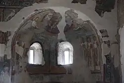 The interior has early medieval frescoes discovered first in 1897. Over the next century, a restoration brought to light more frescoes. The apse has a fresco depicting Christ in Majesty inside a mandorla, above six deacons. Below this register is the scene of 10 armed knights and a mother and child are depicted. Other Romanesque frescoes are visible on the ceiling. The counter-facade depicts the Last Judgement and three patriarchs painted circa 1060 circa.[1][2]