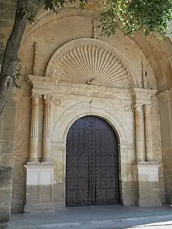 The north portal is constructed in the Plateresque style and supported by two large buttresses. It has a semicircular arch flanked by paired Corinthian columns on plinths, an entablature topped by a large scallop shell with pinnacle decoration on both sides. Above the door, two symbols of the Order of Santiago are carved in circles, indicating the Order's collaboration in the construction of the church and in the repopulation of the area.[4] The south portal is much simpler in structure, built in Doric style with pediment and typical Herrerian spheres as decorative applications.