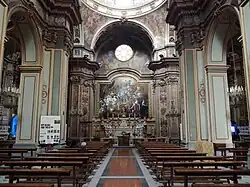 A cycle of frescoes by D'Alessio Elia decorates the transept. The canvas on the left side of the altar, by Solimena, depicts the Virgin between St. Peter and Paul (1684). The Visitation of the Blessed Virgin to Saint Elizabeth on the door of the sacristy is by De Mura, as well as the Adoration of Shepherds placed on the right side of the transept.