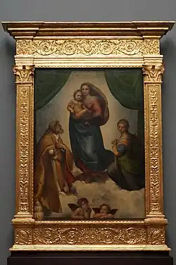 At the end of the Nave, in the choir of the apse is a copy of the Raphael's Sistine Madonna attributed to Pietro Antonio Avanzini.[2] To the great loss of Piacenza, the Benedictines pawned off the original in 1754 to Augustus III, King of Poland for the lordly sum of twelve thousand zecchini. The painting is now one of the masterpieces on display at the Gemäldegalerie in Dresden;[3]