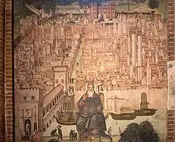 In front of the crypt there is a polychrome marble statue of San Teodoro dating back to the fourteenth century, which bears the symbolic representation of the city of Pavia. On the pillars of the church there are numerous votive frescoes from the 13th century.[7] In the first span of the left aisle, behind the baptistery, there are two views of Pavia, the first, completed, was torn and brought back to canvas in 1956, since during the restorations it was realized that it concealed a second unfinished fresco (with the same theme). The views were commissioned by the parish priest Giovanni Luchino Corti as a civic ex voto for the victory in the siege of 1522 (in that year the city was besieged by the French, who were however defeated) and were, perhaps, made by Bernardino Lanzani or by an anonymous Lombard artist (defined by critics as Master of the Stories of Sant'Agnese) between the 1522 and 1524. The city is represented in a realistic way, the main buildings of Pavia can be observed, while fighting around the walls are also represented. In the center stands the figure of Saint Anthony the Great (owner of the chapel and protector of the suburb of Pavia located beyond the Ticino) while in the sky, above the city, are the figures of the Eternal Father, the Saint Syrus, Teodoro and Augustine. While the ceiling of the chapel is frescoed with grotesques with an archaeological and sacred subject at the same time, including the Adoration of the Magi.[8]
