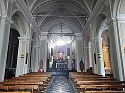 During the 16th-17th centuries, a nave was added with other additions in 1770–80. The interior contains a carved wooden lintel of 1654.[3] The walnut baptistery dates to 1570. Baroque decorations were handmade in the second half of the 17th century by the parish priest Peter Garganico. These decorations include the cupboards of the sacristy, the stucco, the confessionals, the organ with the choir and frescoes. The wooden works -many of which are still present inside the church- were built between 1665 and 1685.[4] On the ceiling of the sacristy, there is a fresco depicting the ascension of the Virgin Mary signed by Giuseppe Antonio Castelli. Other frescoes depict the Evangelists and Saints Lucia, Agatha, Agnes and Catherine.[3] The current marble altar, the work of Antonio Albinola Viggiù, dates from the late 18th century, replacing an older one in walnut wood.[4] On the sides of the presbytery are two paintings depicting San Vittore and Our Lady of the Rosary, attributed to Carlo Pozzo (1667). The San Carlo altar on the left is 19th century work by Gabrio Brunati.[4] The two tapestries depicting the Birth of St. John the Baptist and Saint Anthony are works of the Scuola degli arazzi di Esino Lario (Tapestry School of Esino Lario).[3]