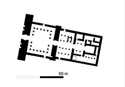 The Treasury is 267m long and is the largest in Sanam. The treasury, while mostly empty, contained elephant tusks and could have stored royal goods due to its size.[3] The excavations by Griffith, with additions by others, produced a drawing of the specifications of the Treasury. The treasury, extensive in size, also contained a courtyard with 35 rooms surrounding it. The Treasury was ruined by a fire but most of it had been cleared prior to the destruction. Griffith revealed a seal that would anticipate the treasury existed from 747-716 BC to 593-568 BC. The goods were not only stored here but distributed from the Treasury.[4]