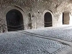 In late republican and imperial times the traffic that crossed the city of Tibur (and therefore the sanctuary) had increased to the point that it was necessary to set up rest and sorting camps for wagons and herds, with related assistance and health control services, upstream and downstream of the bridge (the Roman bridge probably fell in the great flood of 105 AD[14]) which crossed the Aniene near the temples of the Acropolis (also built at the beginning of the splendour of the city, II-I century BC). The rest camps upstream (towards Abruzzo) were probably in Crocetta, about 2 km from the city; those downstream from the clivus tiburtinus almost reached the Lucan bridge. These lands were all owned by the sanctuary.