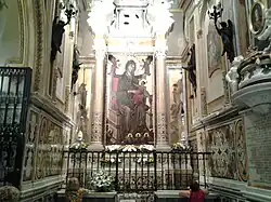 Another chapel was built around the 13th century by Philip I of Anjou: originally it housed the painting of the Madonna, until 25 November 1960, when the painting was moved to the Cathedral Basilica and the chapel was converted to the cult of the Crucifix; however, on 25 June 2012, it returned to host the effigy of the Virgin. The altar of the chapel dates back to 1628 and is surmounted by two columns, in the center of which was placed an 18th-century crucifix, later replaced by the panel of the Madonna; on the sides of the columns the depictions of Matthew and Luke. The vault is decorated with paintings by Vincenzo Volpe, depicting the Child Mary, the Assumption and the Immaculate Conception: other paintings by the same author on the right side of the chapel including the Apparition of the Savior to San Guglielmo; also of fine workmanship is the funeral monument of Catherine II of Valois, wife of Philip of Anjou and her two children Louis and Maria.[27] Among the other works in the chapel are a marble niche where the remains of Abbot Guglielmo De Cesare are kept, depictions of Saint Bernard, Saint Anselm and a canvas of the Nativity.[28]