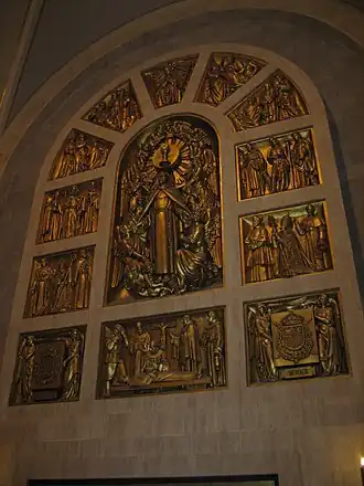 The Royal Chapel also has a Eucharistic relief in gilded bronze in the tabernacle, at the foot of the sepulcher, and a cycle of six sculptural panels on the sides in the form of semicircular apses, representing some moments in the life of St. Paschal. At the entrance to the chapel there are panels with the following scenes: "The young shepherd Paschal receives the Alcantarine sackcloth from St. Francis and St. Clare", "The stoning of St. Paschal in French lands and the triumph of the Eucharist" and "St. Paschal, writer and master of novices". In the frontal apse are the scenes: " St. Paschal exercising charity", "The funeral of the Saint" and "Interview of Father Ximénez with Philip II to promote the canonization of St. Paschal".[5]