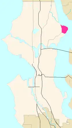 Sand Point is a neighborhood in Seattle, Washington, United States, named after and consisting mostly of the Sand Point peninsula that juts into Lake Washington, which is itself largely given over to Magnuson Park. Its southern boundary can be said to be N.E. 65th Street, beyond which are Windermere and Hawthorne Hills; its northern boundary, N.E. 95th Street, beyond which is Lake City. The western limit of the neighborhood, beyond which are View Ridge and Wedgwood, is not fixed and can be said to be anywhere up the hill that extends west from Sand Point Way N.E. as far as 35th Avenue N.E. It is also the former home of Seattle Naval Air Station.