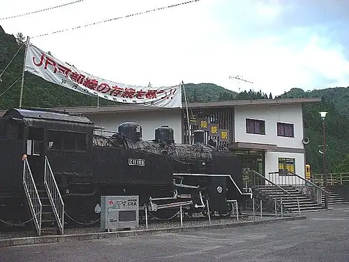 ![]() Sandankyō Station and preserved C11 steam locomotive in 2003 | |