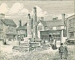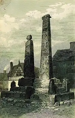 The most recent and authoritative dating places the larger cross from the early part of the 9th century, and the smaller from about the middle of that century.[4] Older theories, now outdated, included the view that they were erected to commemorate the conversion to Christianity of Peada of Mercia about 653.[5][6] Other sources date them to the 9th century.[1][2] The original site of the crosses is unknown and it is believed that they were brought to Sandbach in the Middle Ages.[2] The earliest documentary evidence is by William Smith, the Rouge-Dragon Pursuivant at Arms of Elizabeth I, who was from Nantwich. In 1585 he wrote 'two square crosses of stone, on steps, with certain images and writings thereon graven [standing] hard together.[7][8] Either after the Reformation or during the Civil War they were thrown down[2] and their parts were scattered over a wide area.[5] Larger pieces of the crosses were found as far away as Oulton and Tarporley while smaller pieces were found on various sites in Sandbach. In the early 19th century they were collected together and in 1816 were reassembled and erected under the direction of George Ormerod, the Cheshire historian.[4]