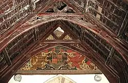 The earliest parts of the Church of England parish church of St Martin include the north arcade, which has octagonal columns and three bays. The chancel may have been completed in 1273, which was when the church was redecorated. The south door and vaulted porch are Decorated Gothic. Later in the Middle Ages Perpendicular Gothic features were added, notably the clerestory of the nave and the embattled west tower. On the east side of the chancel arch is a painting of the arms of Queen Elizabeth I[7] on a panel of wood.[8] The church was restored in 1856 to designs by GE Street, who had the chancel rebuilt. One window in the church has stained glass made in 1974 by John Piper and Patrick Reyntiens to symbolise the Legend of Martin's cloak.[8] St Martin's is a Grade II* listed building.[7]