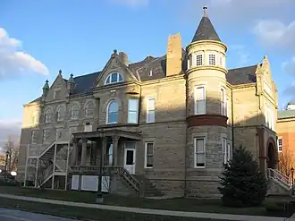 In 1844, Sandusky County government officials arranged for the construction of a new courthouse on what is now Park Avenue in downtown Fremont.[2] By the end of the century, the county owned property at the intersection of Clover and Croghan Streets,[3] in the same block as the courthouse.[4] Construction began after a cornerstone-laying ceremony on 6 November 1890, at which the main speaker was former President of the United States and Fremont resident Rutherford B. Hayes.[3]