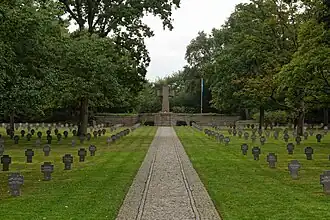 Following an agreement reached in 1952 between the Grand Duchy of Luxembourg and the Federal Republic of Germany, 5,286 bodies were moved to Sandweiler from 150 different cemeteries throughout Luxembourg.[1] They had mostly lain in mass graves for which only incomplete records were available and the German War Graves Commission (Volksbund Deutsche Kriegsgräberfürsorge) set about identifying as many as possible.[1] As a result, 4,014 of the 4,829 in the communal comrades' graves are now identified and listed.[2]