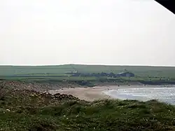 The coast, except at the small sandy bay[2] (whence the parish's name) consists of cavernous cliffs, from 100 to 200 ft, and includes a lofty natural arch called the hole of Rowe, and is much flanked by insulated pillar-rocks.[2]