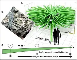 Sanfordiacaulis is an indeterminate vascular plant, roughly 2 m (6 ft 7 in) in height, with a non-woody stem 16 cm (6.3 in) wide and a crown width of 5 to 6 m (16 to 20 ft). Its leaves are arranged in a tightly packed, non-Fibonacci spiral, with the portion of the trunk bearing leaves estimated to have had over 200 laterals based on petiole distribution.[1] The trunk is covered in elliptical leaf bases (not visible on the upper portion due to the leaves obscuring them), with no evidence of a downward-facing leaf skirt like in palm trees. The bases of the petioles are decurrent (extend down the stem) and extend upwards for around 7 cm (2.8 in) before changing their direction further outwards, with the angle becoming sharper towards the tip down to around 20°. On the adaxial (towards the growth axis) surface a large groove is present, decreasing in size towards the tip which changes the cross-section from cordate (heart-shaped) to triangular/oval. These petioles decrease from around 3 cm (1.2 in) across at the trunk to 1.5 cm (0.59 in) at the tip, with the petioles at roughly a 90° angle from the trunk. Secondary laterals start around 50 cm (20 in) from the petiole base, each around 3-4 mm wide and at least 3 to 4 cm (1.2 to 1.6 in) long. The lack of preserved reproductive structures unfortunately means no classification finer than a vascular plant can be determined.[1]
